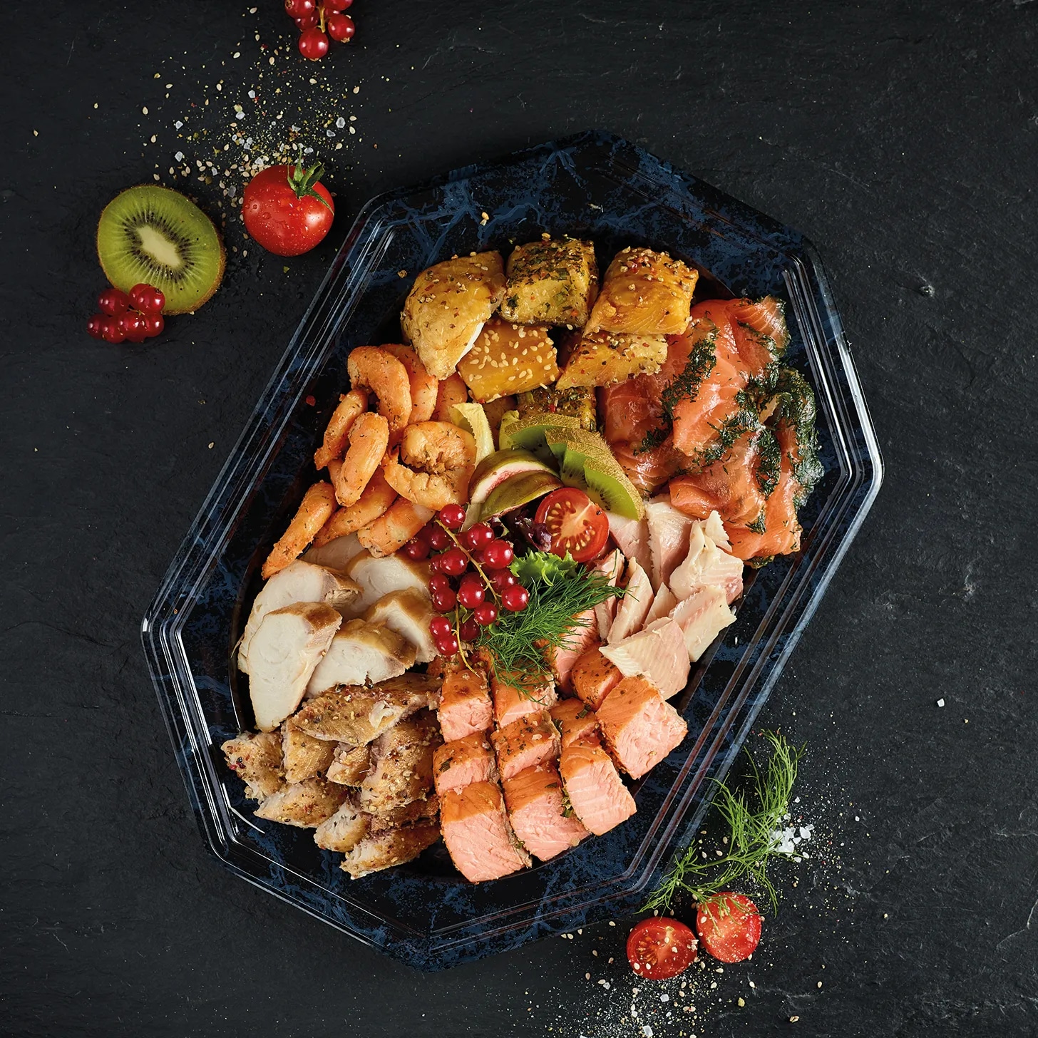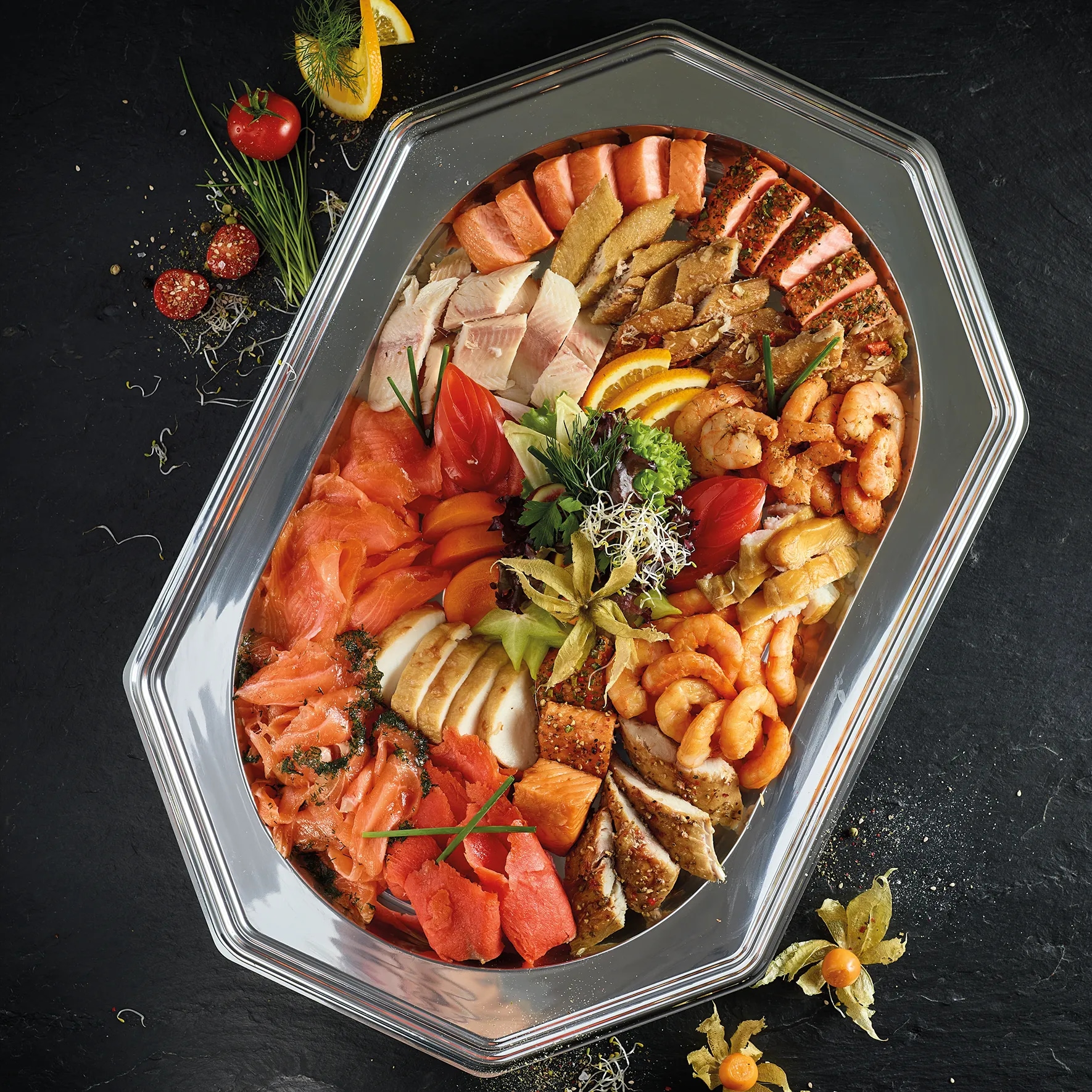 Beispiel für eine mittlere Fischplatte u.a. mit Graved Lachs, Räucherlachs, Forellenfilet, Stremellachswürfel, Makrelenfilet, Buttermakrelenfilet, Räuchergarnelen, Heilbuttwürfel -