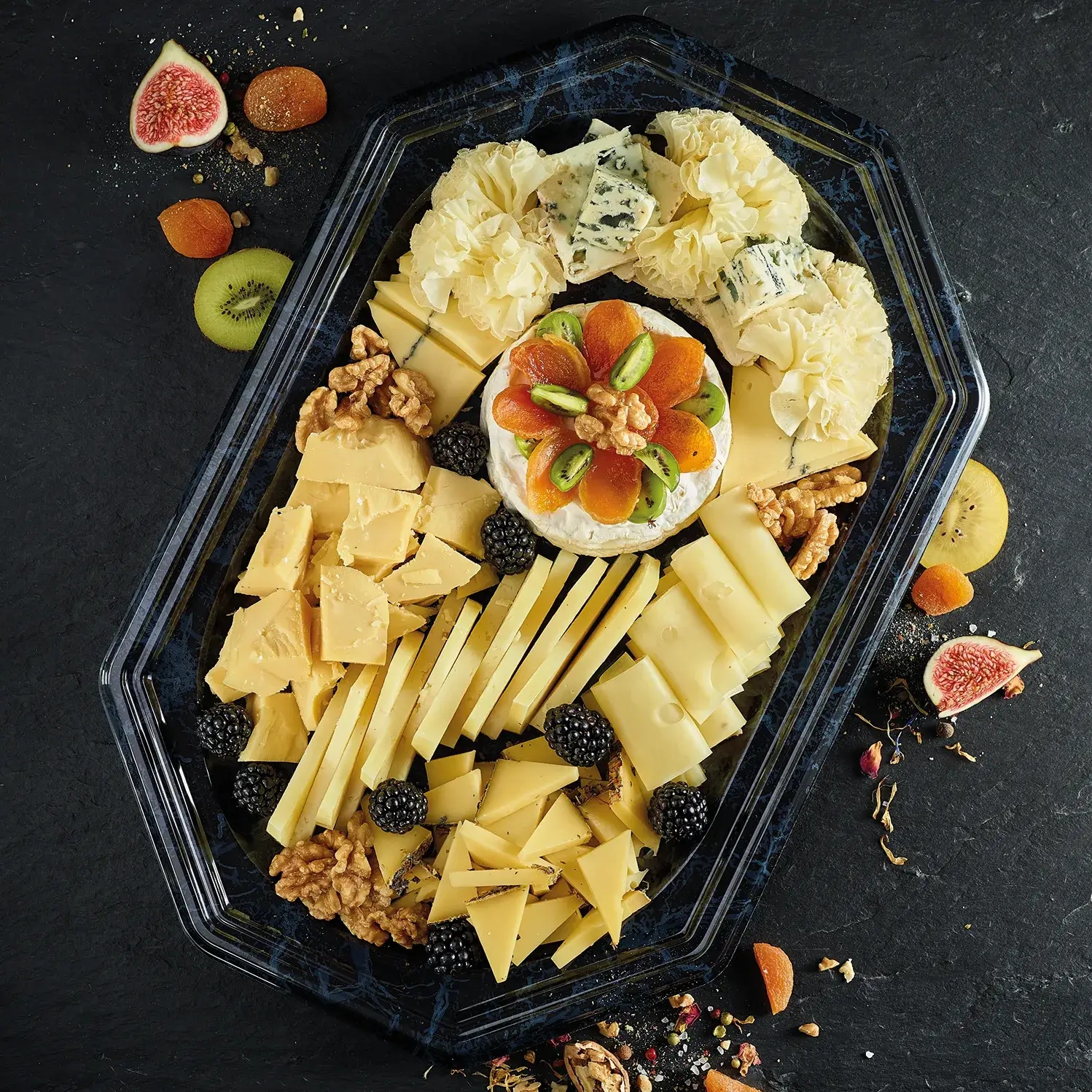 Beispiel für eine große Käseplatte u.a. mit Queso Manchego Don Bernado, Camembert Büffel, Roquefort Papillon, Morbier, Schweizer Emmentaler, Wildblumenkäse, Comté Cyclamen, Tête de Moine Hobelkäse