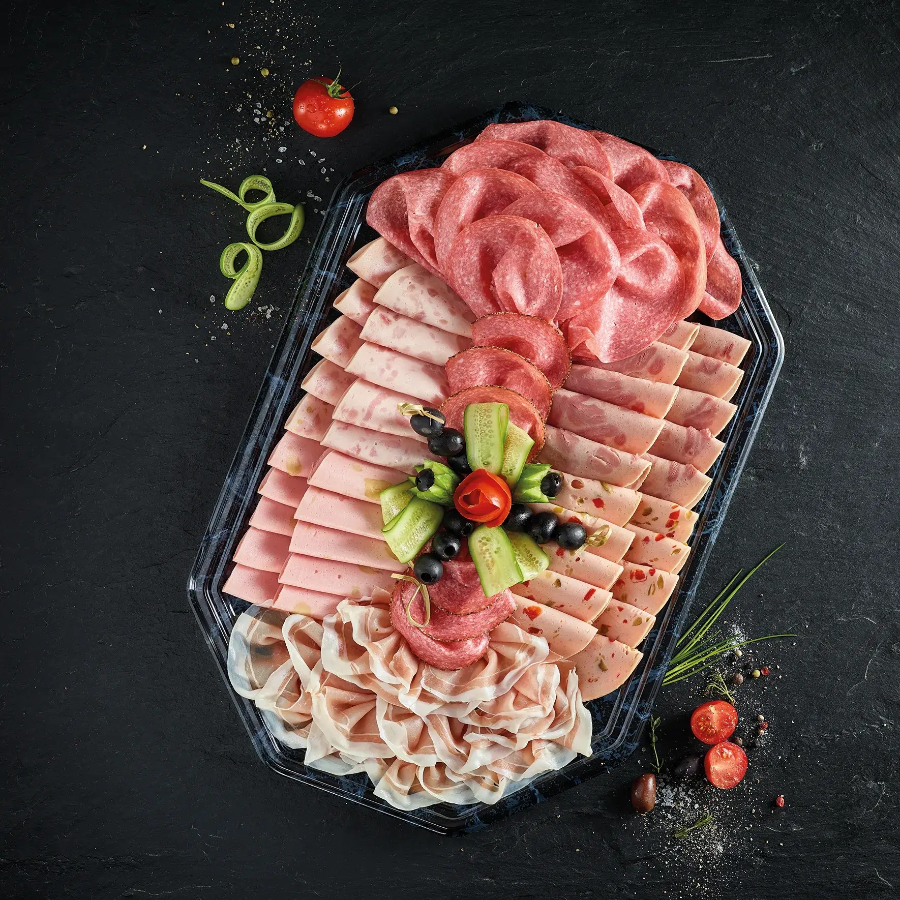Beispiel für eine große Wurstplatte mit Mailänder Salami, Serranoschinken, Roastbeef, Schweinebraten, Kasselerbraten, Premiumkochschinken
