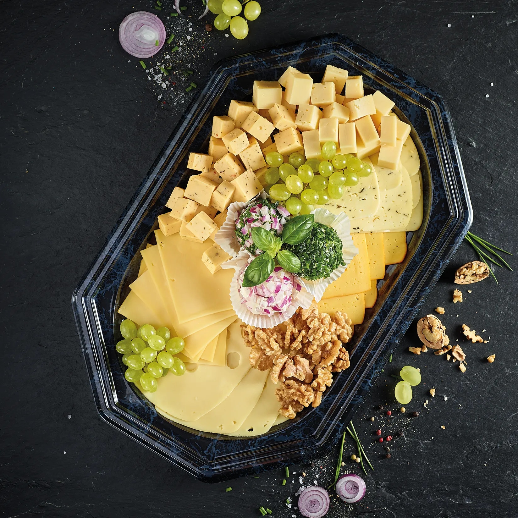Beispiel für eine mittlere Käseplatte u.a. mit Zwiebel-Schnittlauch-Bällchen, Tomate-Basilikumkäse, Gouda jung -