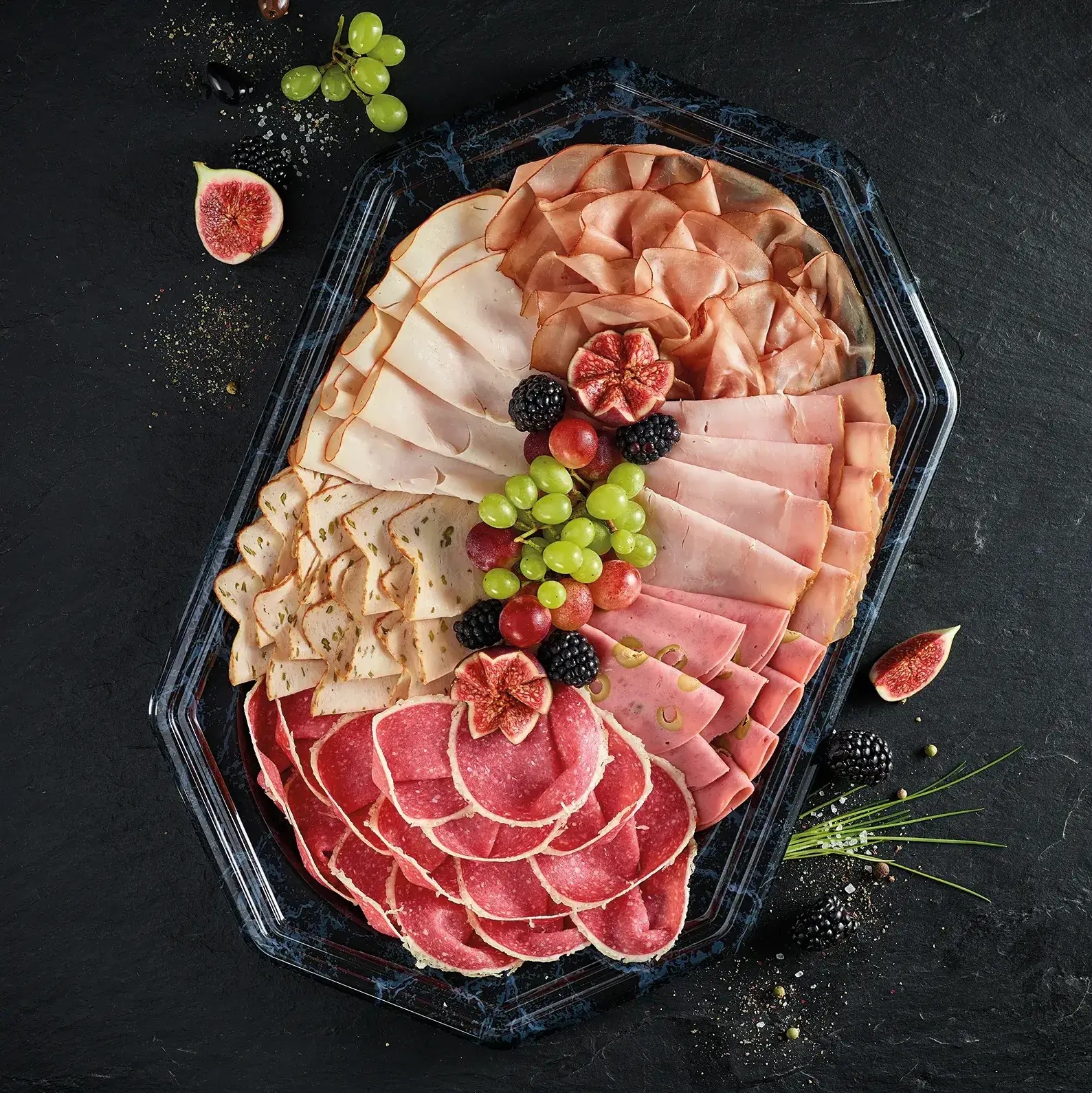 Beispiel für eine mittlere Wurstplatte mit Putenbrust, Hähnchen-Spargel-Pastete, Truthahnsalami, Bille Chickenbarren Käse, Hähnchen-Brokkoli-Aufschnitt, Lachsschinken -