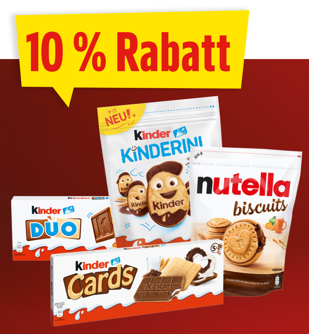 10 % auf Ferrero Kinder und Nutella-Gebäckartikel. Rabattierte Preise wie im Markt ausgezeichnet. Nicht mit Rabattcoupons kombinierbar. -