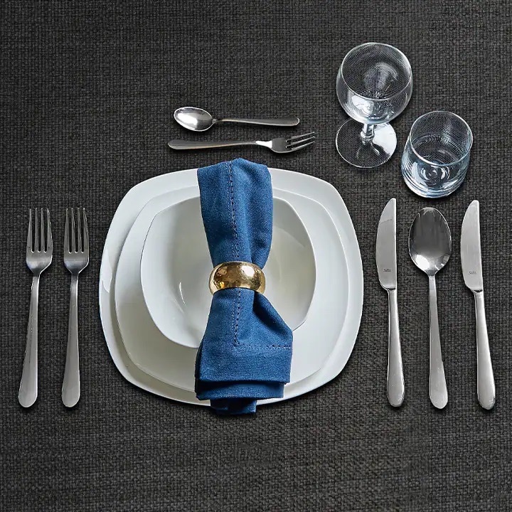 Messer und Suppenlöffel liegen rechts vom Teller, die Messerschneide zeigt dabei nach links zum Tellerrand. Die Gabeln liegen links vom Teller mit den Zinken nach oben. Das Dessertbesteck liegt quer oberhalb des Tellers. Dabei liegt die Gabel mit dem Griff nach links direkt über dem Teller, der Löffel mit dem Griff nach rechts über der Gabel. Die Gläser werden oberhalb der Messer aufgestellt, beginnend rechts in der Reihenfolge der Benutzung. Ganz außen steht deshalb ein Wasserglas, links daneben ein oder zwei Weingläser – abhängig davon, wie viele Weine Du zum Weihnachtsmenü reichst.