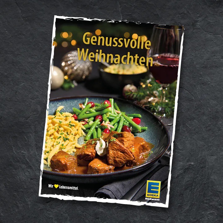 Rinderrouladen, Wild-Ragout oder Kabeljau in Muschel-Safran-Sud – in der neuen Weihnachtsbroschüre von EDEKA Südwest findest Du zahlreiche raffinierte Rezepte. Dazu haben wir für Dich die passenden Wein-Empfehlungen vom Ortenauer Weinkeller sowie tolle Angebote für ganz viel Festtagsgenuss.