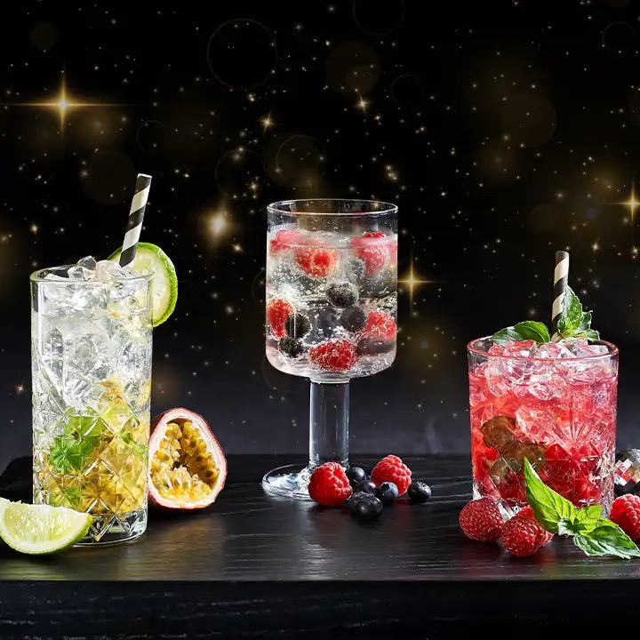 Als Aperitif vor dem Essen oder ein Cocktail zum Ausklang des Abends: Serviere Deinen Gästen doch den einen oder anderen Weihnachtsdrink. Wir haben drei festliche Kreationen mit den Erfrischungsgetränken von Schwarzwald-Sprudel für Dich: einen Wild-Berry-Spritz (M.), einen Himbeer-Mojito (r.) und einen alkoholfreien Ipanema.