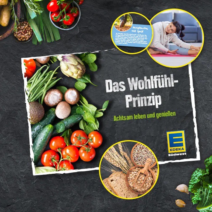 Warum Du bei Obst und Gemüse auf die Formel „5 am Tag“ setzen solltest, wieso Bewegung gut tut und warum Achtsamkeit mehr als ein Modewort ist – das alles erfährst Du in unserer Broschüre „Das Wohlfühl-Prinzip – achtsam leben und genießen“.