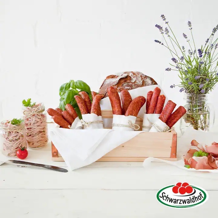 Unser Produktionsbetrieb Schwarzwaldhof in Blumberg stellt ein vielfältiges Schinken- und Wurst-Sortiment her, das perfekt für einen Brunch ist. Von Schwarzwälder Schinken über Landjäger bis hin zu Wurstsalat – hole Dir ein Stück Schwarzwald auf den Esstisch. Übrigens: Das Fleisch für den Schwarzwälder Schinken unter der Marke Schwarzwaldhof stammt aus Baden-Württemberg, wodurch u. a. die heimische Landwirtschaft gestärkt wird. Tipp: Wenn Du den Brunch als Büfett anrichtest, kannst Du den Wurstsalat in kleinen Gläsern für Deine Gäste bereitstellen sowie den Schwarzwälder Schinken und die Landjäger hübsch anrichten. Genauso wie auf unserem Foto.