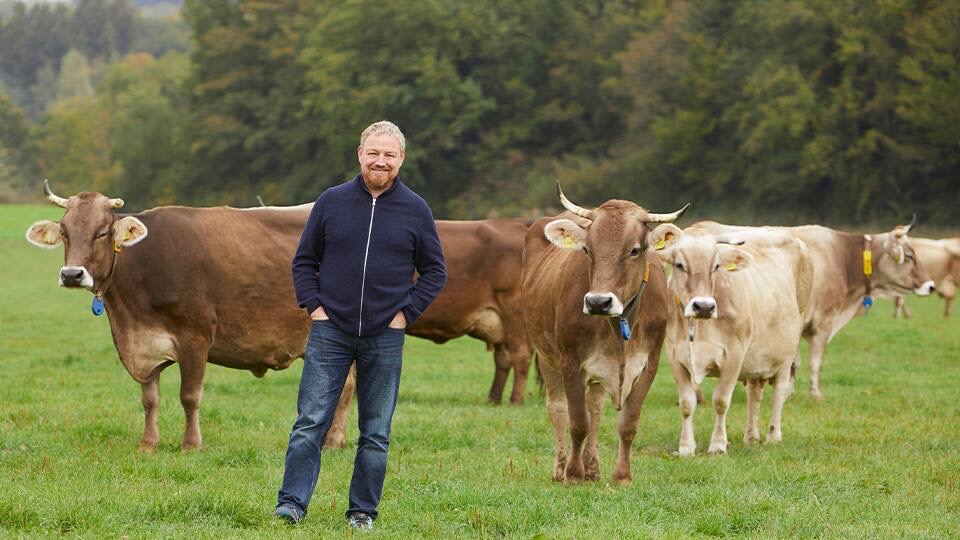 Seit 2006 gibt es bereits unsere Regionalmarke „Unsere Heimat – echt & gut“, für die über 1.500 Erzeugerinnen und Erzeuger wie Hubert Merz (Bild) aus dem Südwesten insgesamt über 360 Lebensmittel produzieren. Dazu zählen neben saisonalem Obst und Gemüse auch Milch, Käse und andere Molkereiprodukte sowie unter anderem Eier, Wurst, Saft, Nudeln und Senf. Ein Teil der Artikel unserer Regionalmarke stammt von Betrieben, die einem der Bio-Verbände Bioland, Demeter und Naturland angehören.