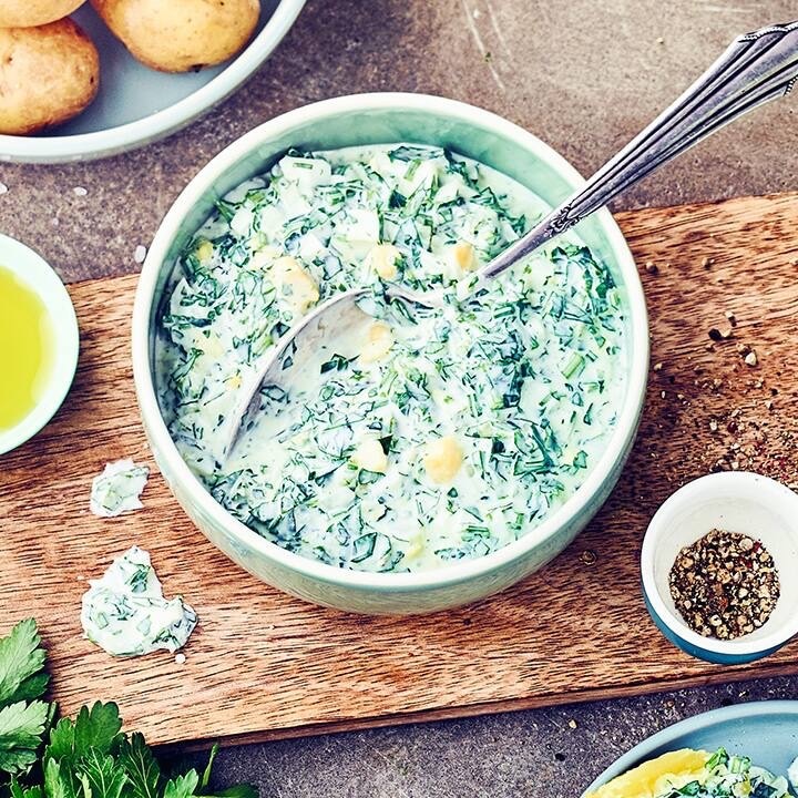 Aller gute Dinge sind nicht drei, sondern sieben – wenn es um die „Frankfurter grie Soß“ geht. Denn sie wird traditionell aus sieben verschiedenen Kräutern zubereitet: Borretsch, Kerbel, Kresse, Petersilie, Pimpinelle, Sauerampfer und Schnittlauch. Ganz klassisch wird sie zu Salzkartoffeln und hart gekochten Eiern gereicht. Du kannst die kalte Sauce aber auch zu Fleisch- und Fischgerichten servieren. Probiere doch mal unser Rezept hier.