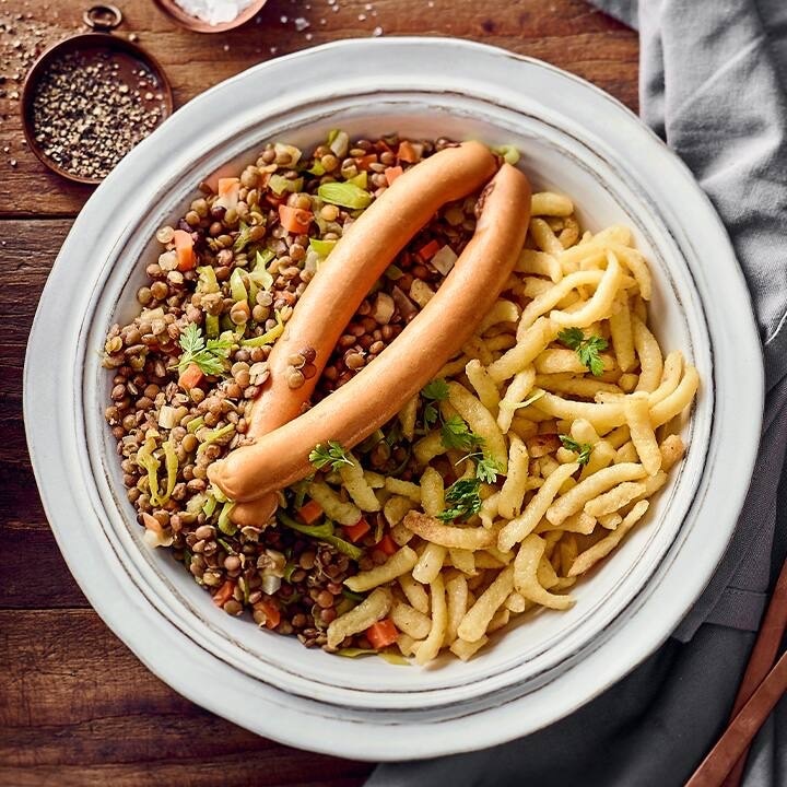 Die Kombination von Linsen und Spätzle ist ein Klassiker der schwäbischen Küche. Das Gericht wird oft mit Saitenwürstchen serviert. Galten Linsen lange Zeit als Arme-Leute-Essen, so kommen die Hülsenfrüchte heute sogar in der Spitzengastronomie zum Einsatz. Bei uns im Südwesten wurden Linsen bereits vor Tausenden Jahren auf der Schwäbischen Alb angebaut. Die anspruchslosen Pflanzen gedeihen auch heute noch gut auf den kargen Böden der Alb. Es ist üblich, die Linsen mit Essig abzuschmecken – die angenehme Säure harmoniert wunderbar mit dem herzhaften Aroma der Hülsenfrüchte.