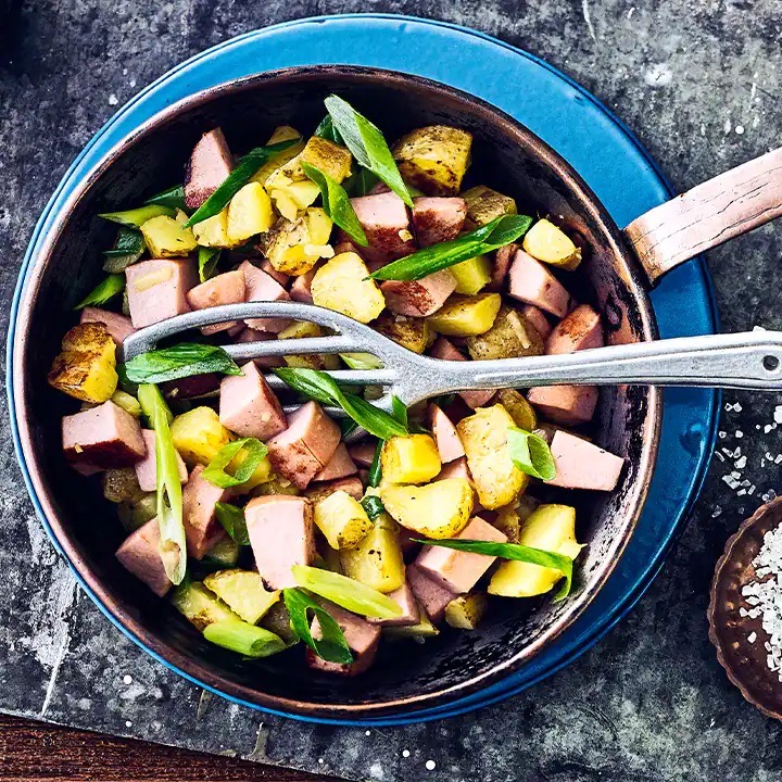Die deftige Pfannenmahlzeit ist im Saarland eine Art Nationalgericht. Die Hauptzutaten sind Lyoner, Kartoffeln und Zwiebeln, die zusammen angebraten werden. Übrigens heißt es in saarländischen Dialekten nicht „die“, sondern „der Lyoner“. Tipp: Wenn Du Kartoffeln vom Vortag übrig hast, kannst Du diese wunderbar für das Gericht verwenden. Du kannst beim Zubereiten der Lyonerpfanne weitere vorhandene Zutaten wie Gemüse und Speck geschmackvoll mit einbinden und bekommst so ein köstliches Resteessen – für mehr Lebensmittelwertschätzung.