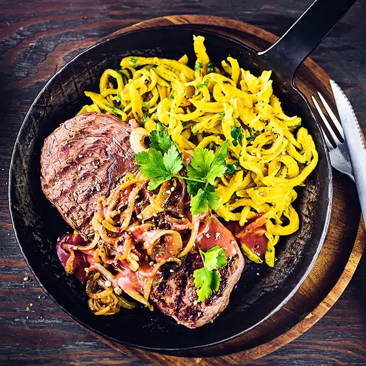 Ein zartes Stück Rindfleisch, das von knusprig gebratenen Zwiebeln gekrönt wird, ist im Schwabenländle besonders beliebt. Für die Zubereitung sind Rumpsteak oder Entrecôte eine gute Wahl. Beide Stücke überzeugen durch eine feine Marmorierung und einen Fettrand, der beim Braten für zusätzliches Aroma sorgt. Dazu passen Bratkartoffeln, ein Salat oder Spätzle – wie in unserem Zwiebelrostbraten-Rezept