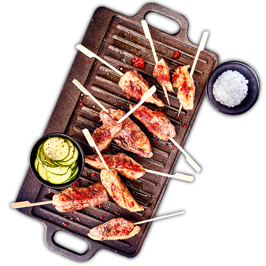 Melone: Einfach vierteln, quer in etwa 1,5 bis 2 cm dicke Scheiben schneiden und pur auf den Grill legen. Das Wasser kühlt und sorgt dafür, dass die Melone nicht verbrennt. Die Hitze bringt alle Aromen noch besser zur Entfaltung. Tauschen Sie in unserem Käsespieße-Rezept einfach den Kokoskäse gegen Grillkäse aus und freuen Sie sich auf den fruchtigen vegetarischen Snack!