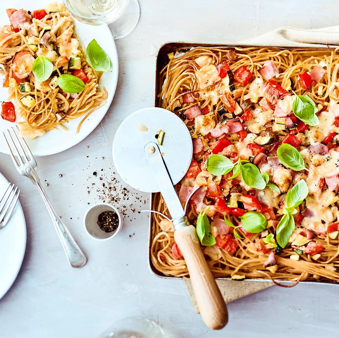 Das A und O für glückliche Gesichter am Esstisch ist Vielfalt – dafür müssen Sie nicht endlose Einkaufslisten mit zahlreichen Zutaten erstellen. Eine einfache Faustregel für eine abwechslungsreiche und zugleich ausgewogene Ernährung lautet: Wenn es auf dem Teller schön bunt aussieht, werden viele Geschmacksrichtungen bedient und der Nährstoffbedarf ist auf breiter Basis gedeckt. In unserem Rezept für Piraten-Nudeln etwa treffen zartgelbe Fusili – als sättigender Energielieferant – auf eine kräftig rote Tomaten-Gemüsesauce, die Vitamin C und Folsäure enthält. Der geriebene Käse dient als Eiweißquelle. Allen, die Pizza und Pasta lieben und sich ungern zwischen den beiden entscheiden, empfehlen wir unser Spaghetti-Pizza-Rezept.