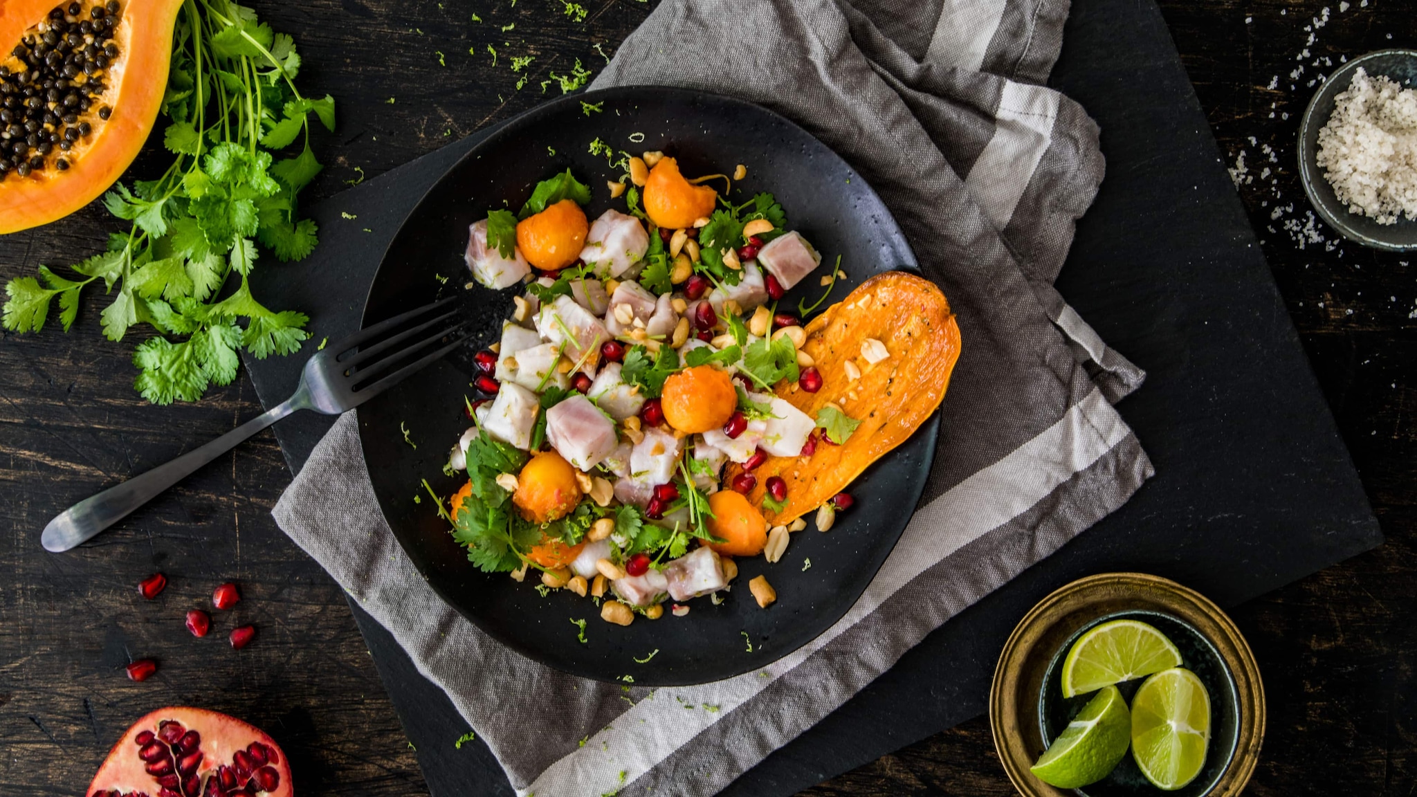 Für warmen vegetarischen Granatapfelgenuss probieren Sie unbedingt unser einfaches Rezept für Hasselback-Süßkartoffeln aus. Das Gemüse wird hier mit würziger Avocado-Aioli gefüllt, im Ofen gebacken und abschließend mit Granatapfelkernen bestreut.