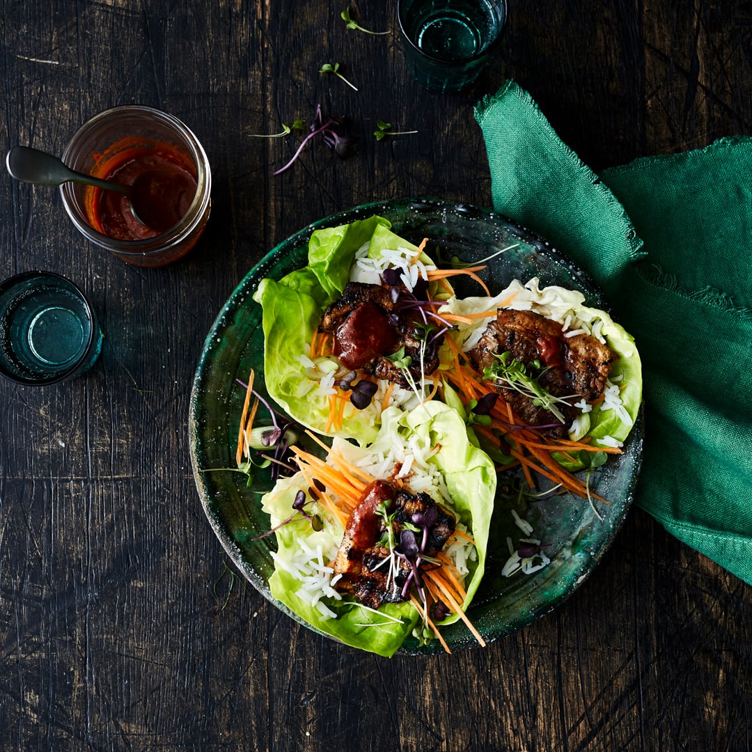 Ssam: Schweinebauch mit Reis und Gemüse in einem großen Salatblatt