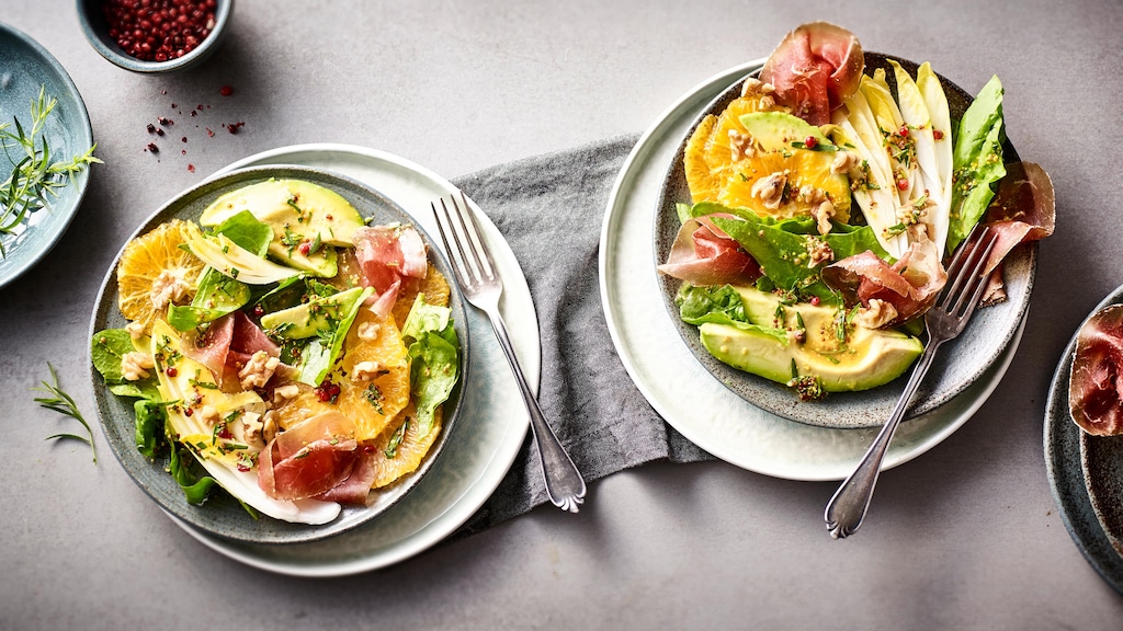Avocados halbieren, die Schale und den Kern entfernen und das Fruchtfleisch in Streifen schneiden. Avocado-Scheiben mit etwas Orangensaft marinieren. Estragon waschen und die Blättchen fein schneiden. Estragon, restlichen Saft, Senf, Honig und Reisessig verrühren. Öl unterschlagen. Mit Salz und Pfeffer würzen. Walnüsse grob hacken und in einer Pfanne ohne Fett rösten. Chicorée, Sauerampfer (oder Spinat), Avocado und Orangenscheiben mit dem Dressing mischen und mit den Walnüssen und Bündnerfleisch (oder Bresaola) anrichten.