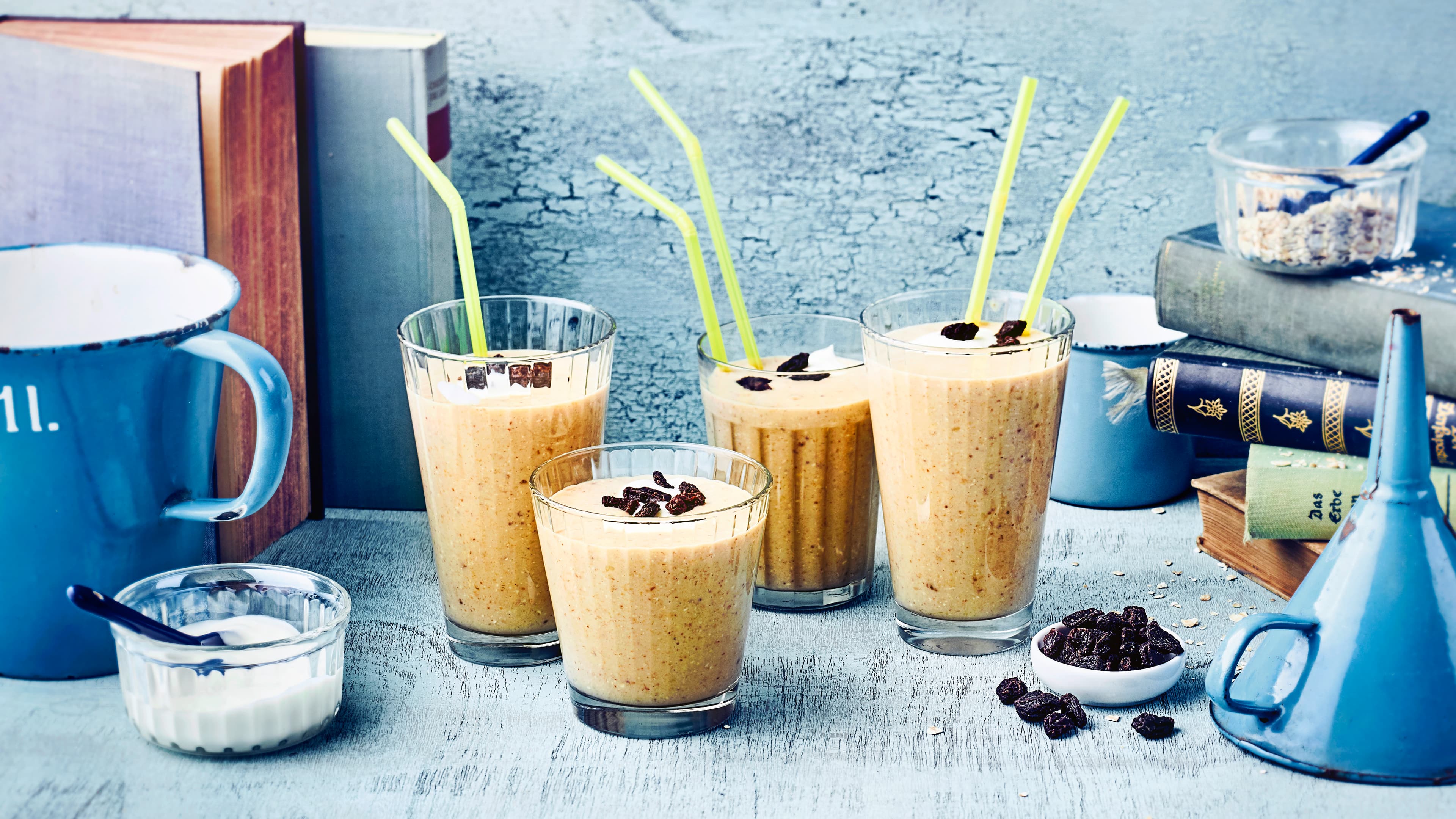 Trifft Frucht auf Milch, entstehen köstliche, nahrhafte Mixgetränke. Unser Bananen-Milchshake ist jedoch keine einfache Bananenmilch. Um Haferflocken, Rosinen und Cornflakes ergänzt, wird er zum vollwertigen Sattmacher.