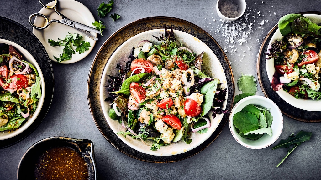 Zwischenzeitlich das Dressing zubereiten. Das Dressing über den Salat geben.