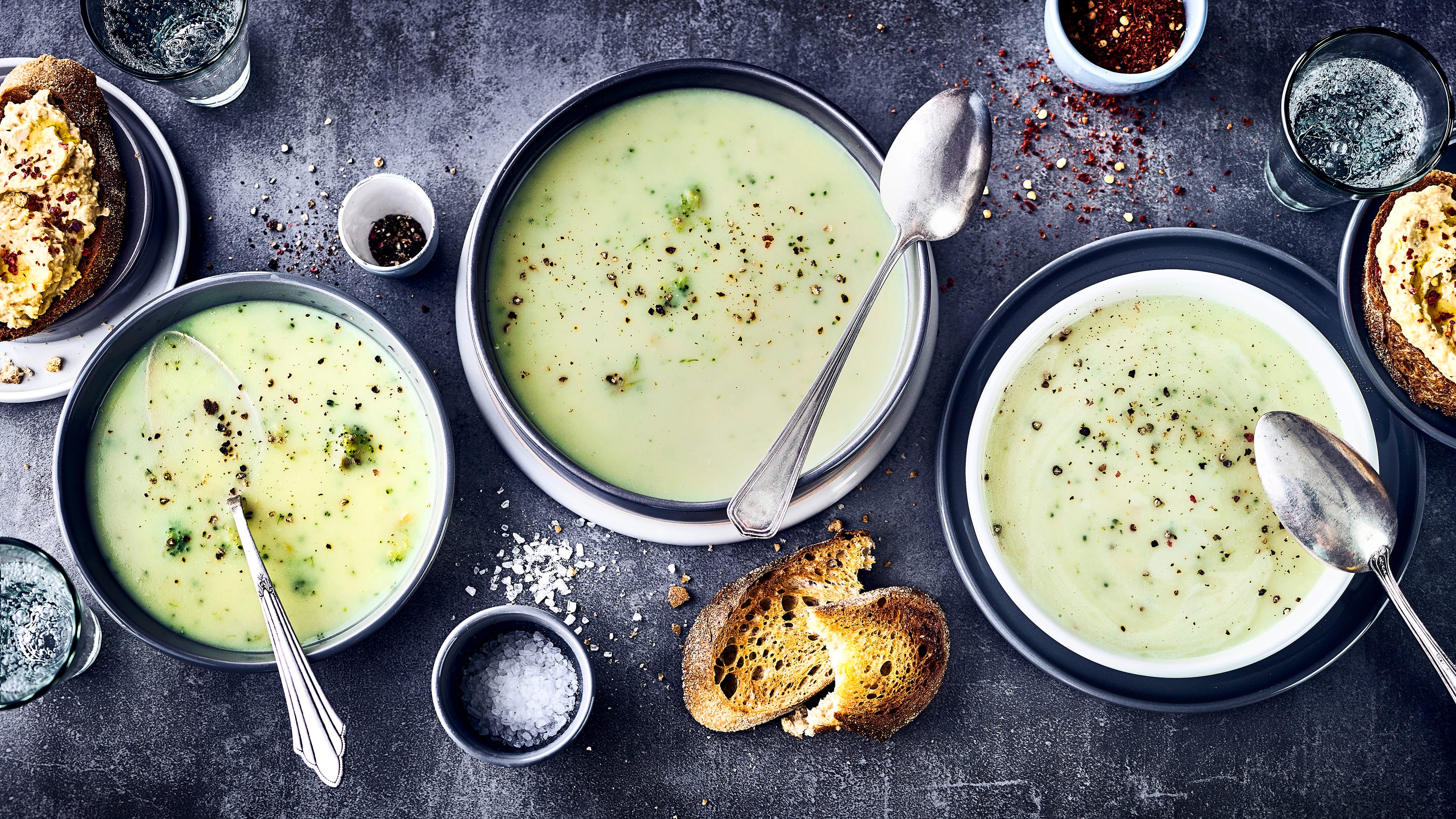 Eine tolle Kombination und schnell zubereitet: Diese cremige Blumenkohl-Broccolisuppe mit knusprigen Crostinis, bestrichen mit selbstgemachtem Hummus.