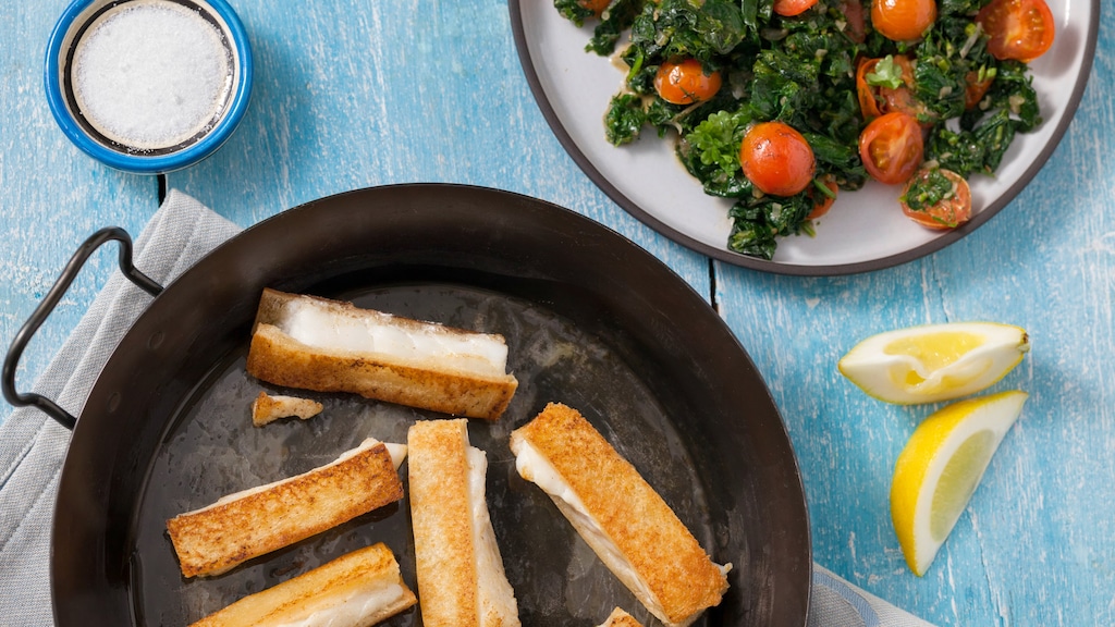 Machen Sie Ihre Fischstäbchen selber und genießen Sie dazu warmen Kräuterspinat mit Kirschtomaten und Schalotten! Mit frischem Kabeljau ohne Haut und ein paar Scheiben Buttertoast sind die leckeren Stäbchen ganz einfach herzustellen.