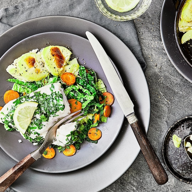 Ein Teller mit zartem Fleisch, rotbrauner Soße, Spätzle und cremigem Wirsingsalat, getoppt mit gehackten Kräutern