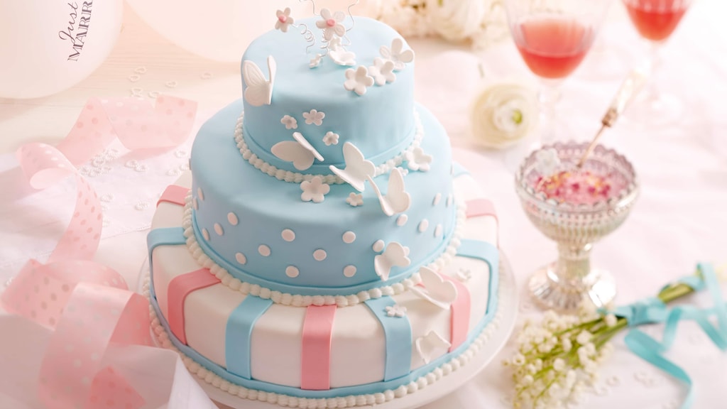 Bei der ersten Torte (26 cm Durchmesser) mit einem Messer 14 Stück für die Streifendekoration leicht markieren. Rosa Fondant 2 mm dick ausrollen und 7 Streifen von 2 cm Breite und 12 cm Länge ausschneiden. Fondant ausrollen und 7 Streifen von 2 cm Breite und 12 cm Länge ausschneiden. Die Streifen mit Zitronensaft bestreichen und abwechselnd von der Unterkante zur Mitte auf die Markierung der Torte legen. Restlichen hellblauen Fondant ausrollen, einen Streifen von 90 cm Länge und 1 cm Breite ausschneiden, eine Seite mit Zitronensaft bestreichen und an die Unterkante der Torte kleben.