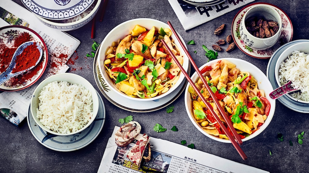 Exotisch und fruchtig: Probieren Sie unser Rezept für mariniertes Huhn mit Ingwer, Sherry, Sake und Sojasoße und genießen Sie dazu Paprika, Ananas und Weißkohl!