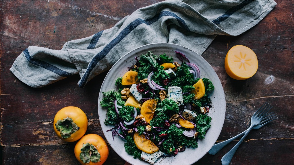 Die Kakis schälen in Scheiben schneiden und halbieren - untermischen. Die Zwiebel in Ringe schneiden und dazugeben. Walnüssen und Cranberries hinzufügen.