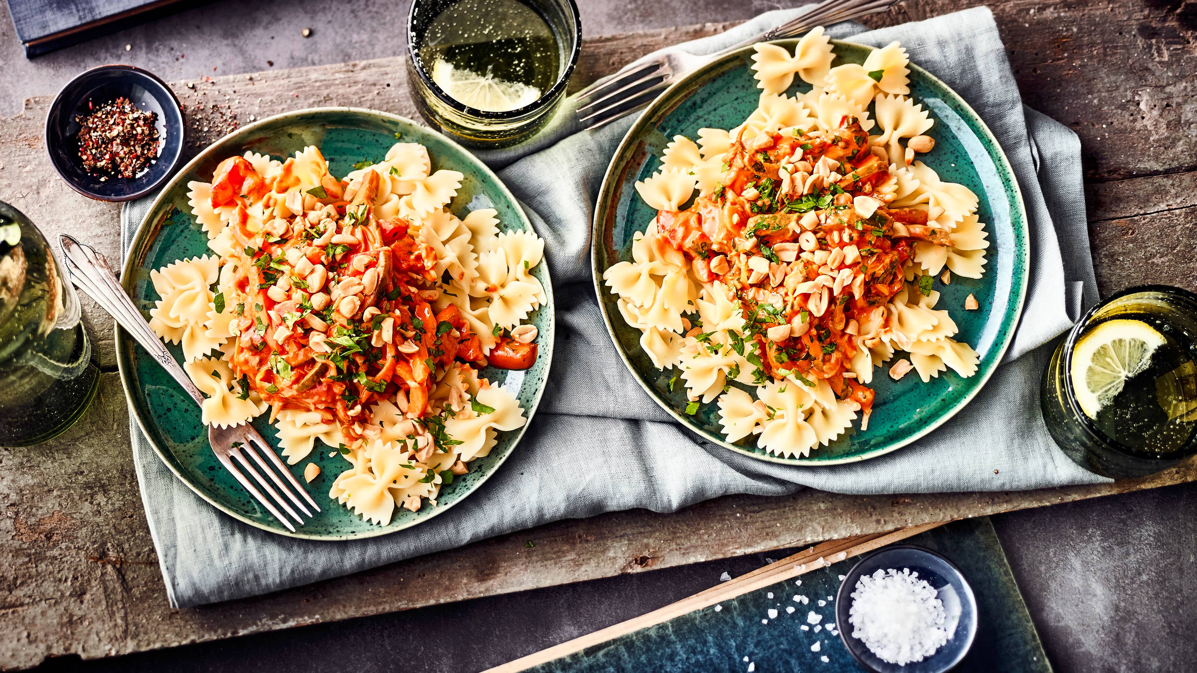 Salzwasser in einen Topf geben und zum Kochen bringen. Die Farfalle in das Wasser geben und 1–2 Minuten kürzer als in der Packungsanweisung angegeben al dente kochen. Anschließend in einem Sieb abgießen und abtropfen lassen, nicht mit kaltem Wasser abschrecken. Die Paprika gründlich waschen, halbieren, Samen und Strunk entfernen und in dünne Streifen schneiden.
