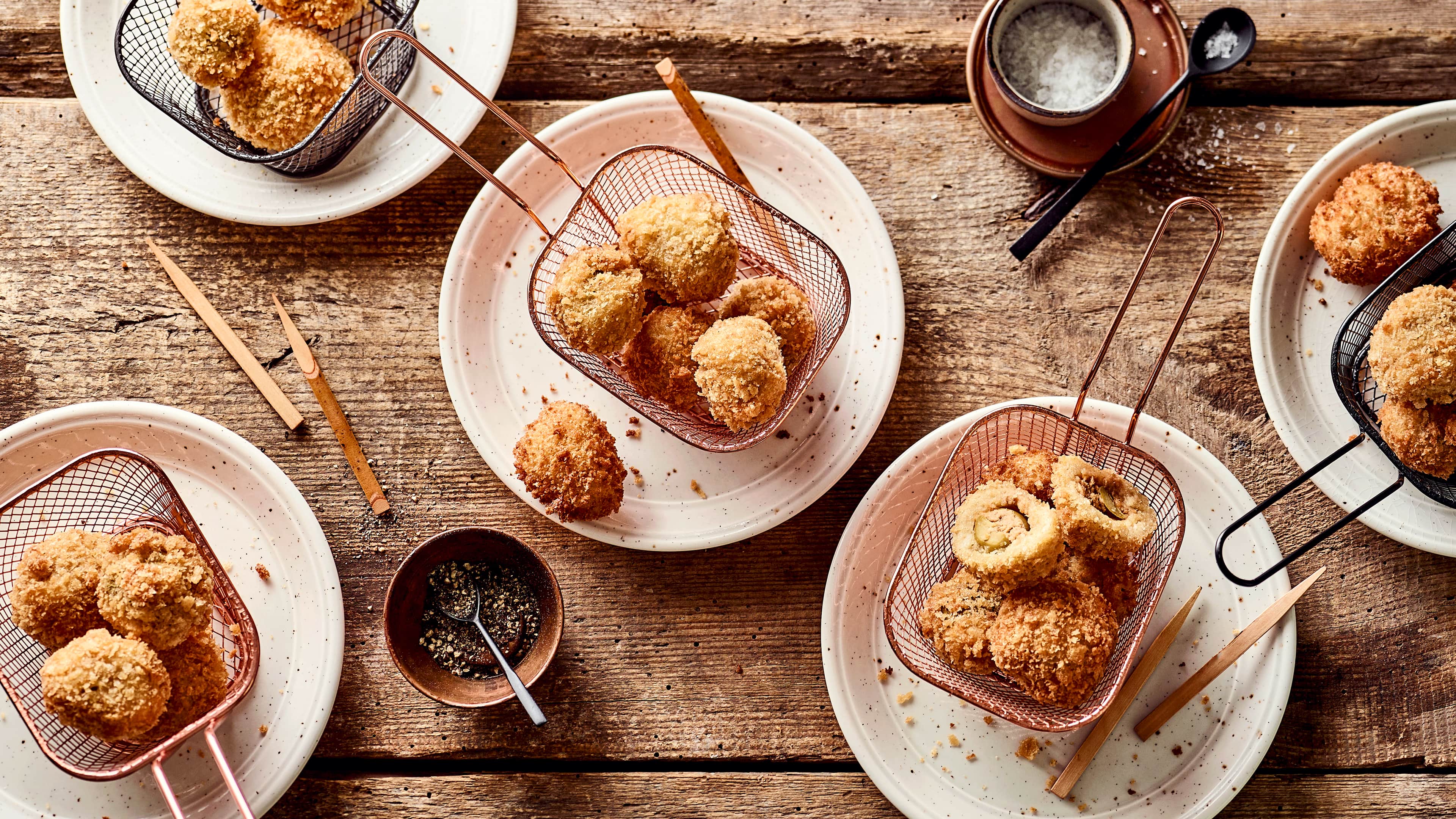 Oliven gehören zur mediterranen Küche wie ihr aromatisches Öl: Die knorrigen Ölbäume wachsen in allen Mittelmeerländern und prägen die Mittelmeer-Rezepte. Nach Spanien, dem weltweit führenden Anbauland für Oliven, folgt Italien. Hier genießt man nicht nur ihr Öl in rauen Mengen, sondern serviert sie auch pur und in vielen traditionellen Gerichten, wie der Pasta alla puttanesca, der Focaccia con olive oder den berühmten Olive ascolane, den Oliven aus Ascoli. Für die Zubereitung der gefüllten Oliven verwendet man grüne, große Früchte der Sorte "Ascolana Tenera", die besonders saftig und fleischig sind. Weil sie etwas größer sind, lassen sie sich auch leichter befüllen. Achten Sie beim Aufschneiden der Oliven vor dem Füllvorgang darauf, ein scharfes Messer zu verwenden, damit sie ganz bleiben.