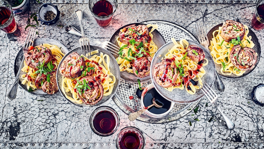 Wie wäre es mit Rinderrouladen mit einer etwas anderen Füllung? Probieren Sie unsere pikante Variante mit Paprika, Oliven und gehackten Mandeln und einer leckeren Möhren-Sellerie-Rotwein-Soße!