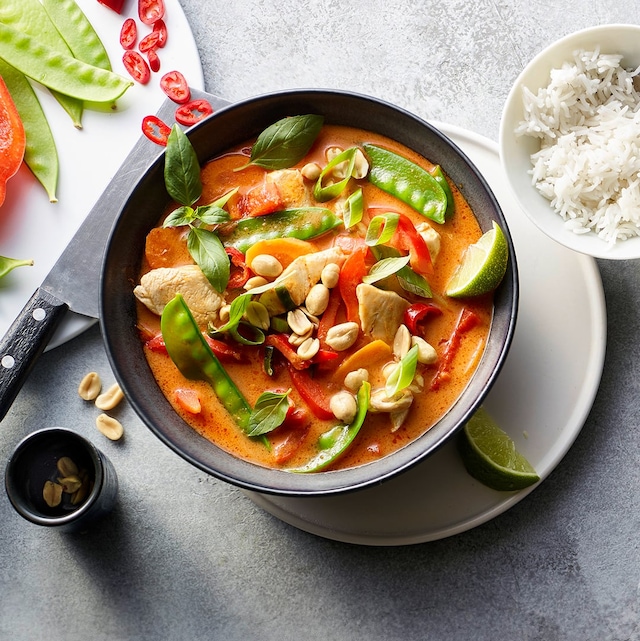 2 EL Öl in einem Topf erhitzen, die Currypaste darin bei mittlerer Hitze 1 Minute anrösten. Die Erdnussbutter einrühren und 1 Minute rösten, bis sie schmilzt. Die Kokosmilch und die halbe Menge Zitronenblätter einrühren und alles zugedeckt 10 Minuten bei schwacher Hitze köcheln lassen.