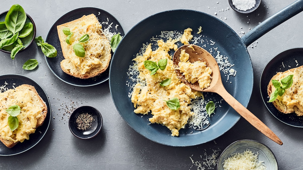 Frisch zubereitetes Rührei gehört zu den beliebtesten Frühstücksklassikern. Hier rühren Sie zur Abwechslung frisch geriebenen Parmesan und einen Schuss Sahne unter die Eiermasse – köstlich! Gleich fürs nächste Sonntagsfrühstück vormerken!
