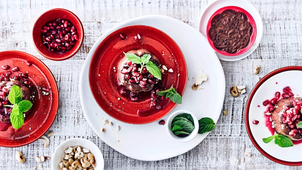 Die Puddingförmchen direkt vor dem Servieren ganz kurz in heißes Wasser tauchen und anschließend auf je einen Teller stürzen. Granatapfel und Cashewkerne dazu anrichten und mit Minzeblättchen verziert servieren.
