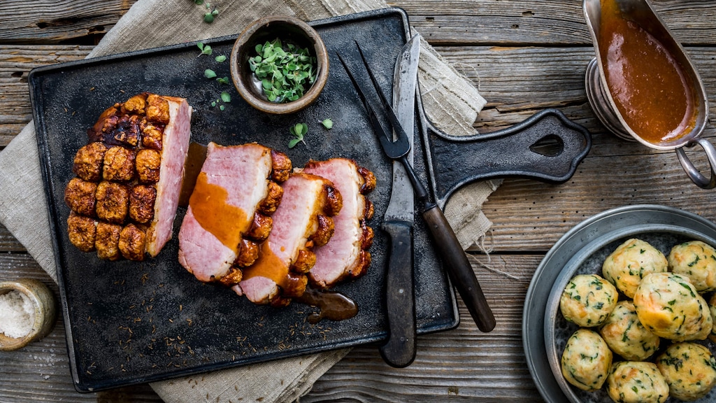 Sie mögen's deftig? Dann haben wir das perfekte Rezept für Sie: unseren Schweinekrustenbraten mit Knödeln und einer kräftigen Biersoße. Dank der wird das Fleisch im Ofen besonders aromatisch und saftig.