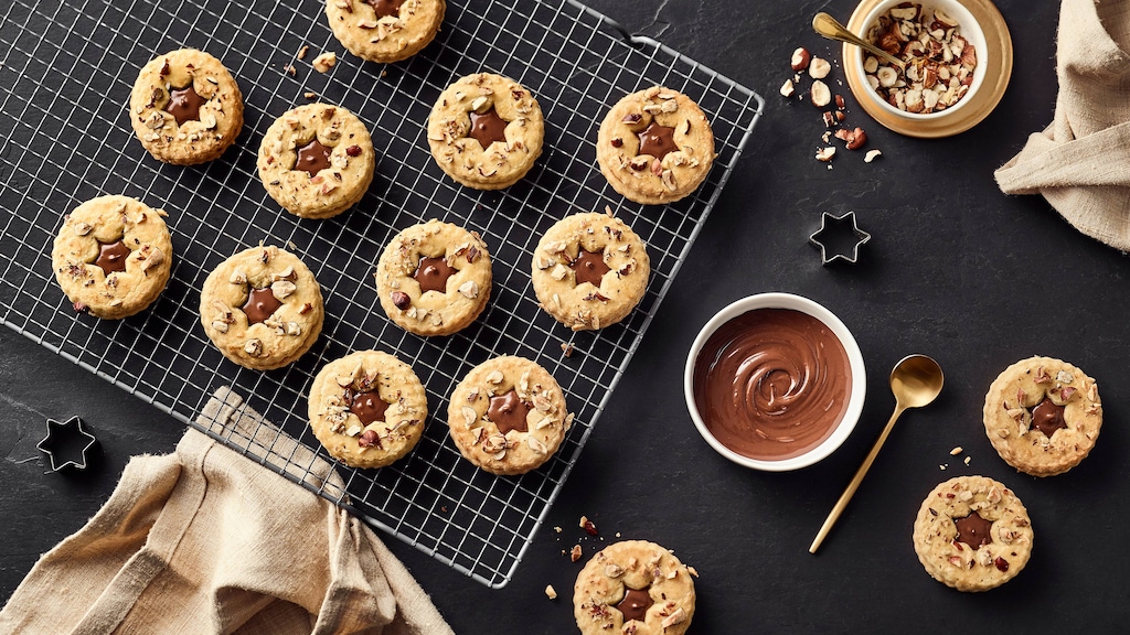 Plätzchen auf ein mit Backpapier belegtes Backblech legen und mit Eiklar bepinseln. Auf die Deckel die gehackten Haselnusskerne streuen, leicht andrücken und Plätzchen im Ofen auf mittlerer Schiene ca. 10–12 Minuten goldbraun backen. Herausnehmen und auskühlen lassen.