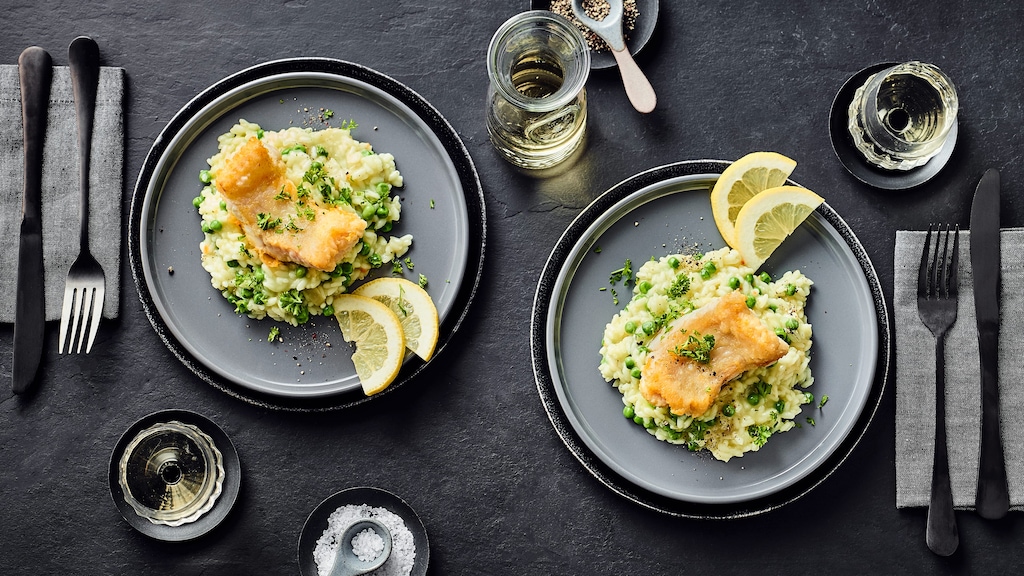 Erbsen-Risotto mit gebratenem Steinbeißerfilet anrichten, mit Petersilie und Zitronenspalten garnieren und servieren.