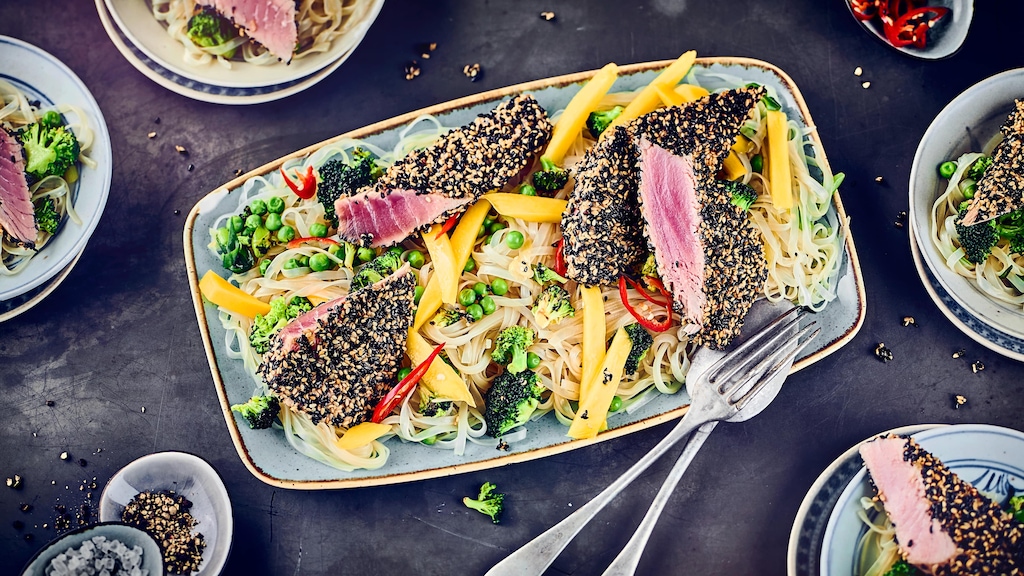 Wussten Sie, dass die Fischart Thunfisch reich an Vitamin B3 ist? Dieses auch Niacin genannte B-Vitamin trägt zur Verringerung von Müdigkeit und Ermüdung bei. Und so lecker zubereitet wie bei unserem Rezept in Sesamkruste kombiniert mit Asia-Salat essen wir doch gerne viel davon.