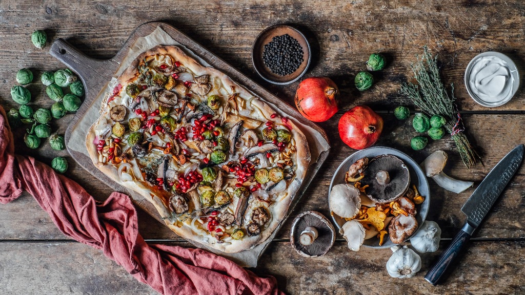 Genauso simpel wie lecker: der Flammkuchen. Der Teig ist schnell gemacht und die Möglichkeiten, ihn zu belegen sind beinahe grenzenlos. Probieren Sie unsere vegane Variante mit pflanzlicher Crème Fraîche und einem köstlichen Topping aus Pilzen und Rosenkohl mit knackigen Granatapfelkernen.