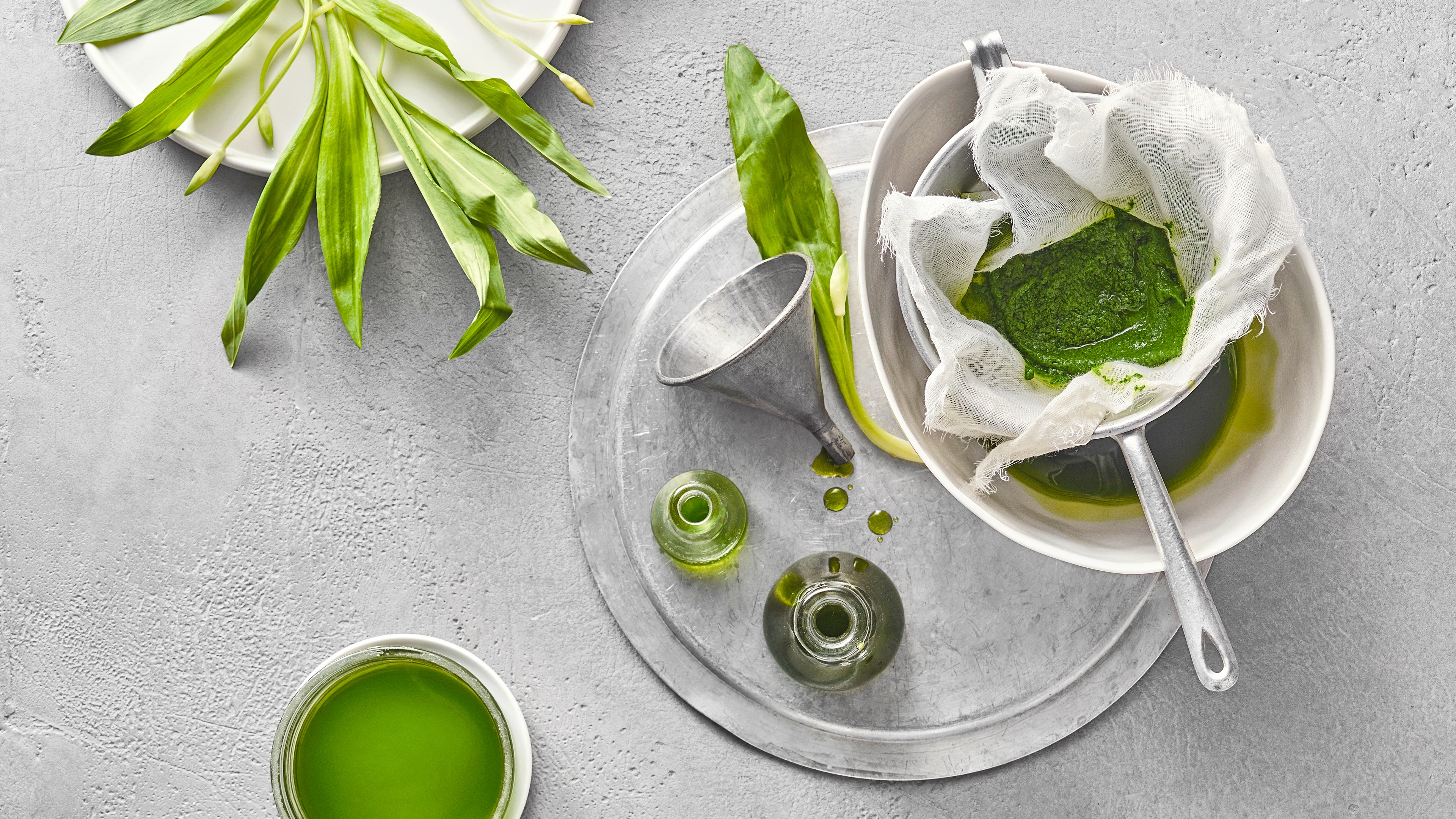 Bärlauchblätter mit Olivenöl in einen leistungsstarken Mixer geben und sehr fein pürieren. Die Mischung nochmals im Topf auf 60 Grad erwärmen für eine intensivere Farbe. Für 1-2 Stunden durch ein feines Sieb mit Passiertuch langsam filtrieren lassen.