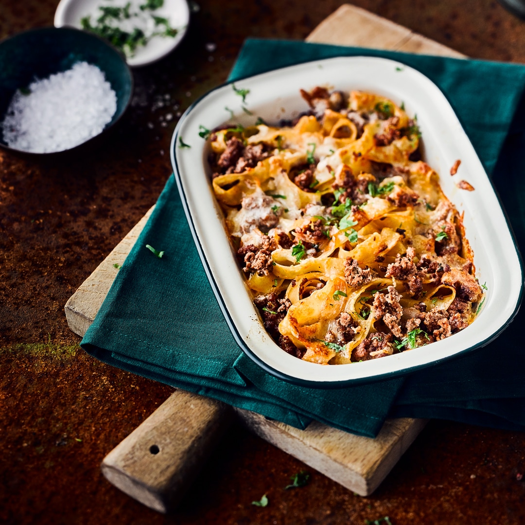 Der richtig Käse macht das Endergebnis meistens doch dieses kleine, entscheidende Stück besser. Aber welchen nehmen? Light-Käse fällt schon mal aus. Er verbrennt schlicht zu schnell. Zum Überbacken sind Fettstufen ab 40 % i.Tr. gut geeignet, denn der Käse braucht einen gewissen Schmelz. Grundsätzlich eignen sich viele Sorten, beliebt sind beispielsweise Emmentaler, Cheddar oder Bergkäse. Auch Mozzarella oder Hartkäse werden gerne für Auflauf-Rezepte mit Tomaten wie beispielsweise den Hackfleisch-Nudel-Auflauf verwendet. Für unseren Hackfleisch-Auflauf verwendest du dagegen Schafskäse – und wer es besonders würzig und außergewöhnlich liebt, stellt sich mit Hilfe einer Käsereibe seine eigene Käsemischung zusammen. Informiere dich weiter zum Thema Kochen und Backen mit Käse.
