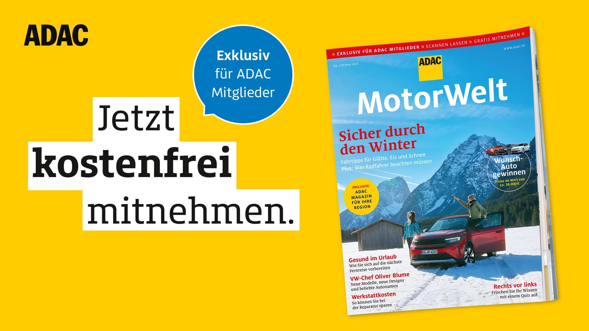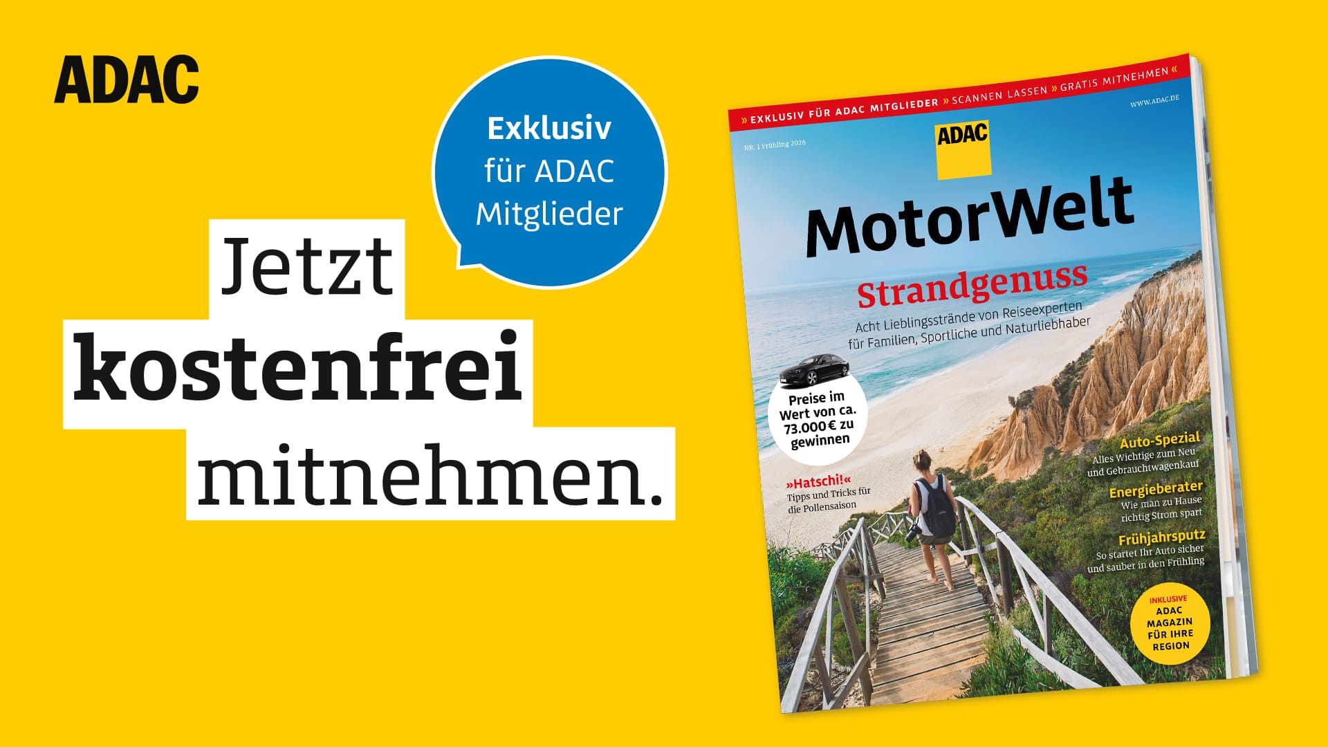 ADAC Motorweltfinder. Einfach das Magazin an der Kasse scannen lassen, ADAC Mitgliedskarte vorzeigen und kostenfrei mitnehmen.