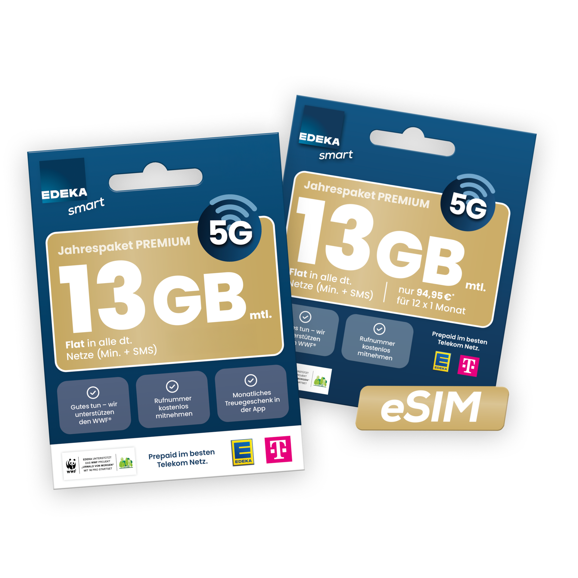 • Das EDEKA smart Jahrespaket Premium kostet 94,95 € / 1 Jahr und enthält 1 Jahr lang jeden Monat: 13 GB Highspeed-Volumen mit bis zu 100 Mbit/s und 5G (danach max. 32 KBit/s im Download und max. 16 KBit/s im Upload) und eine Telefon und SMS Flat in alle dt. Netze.