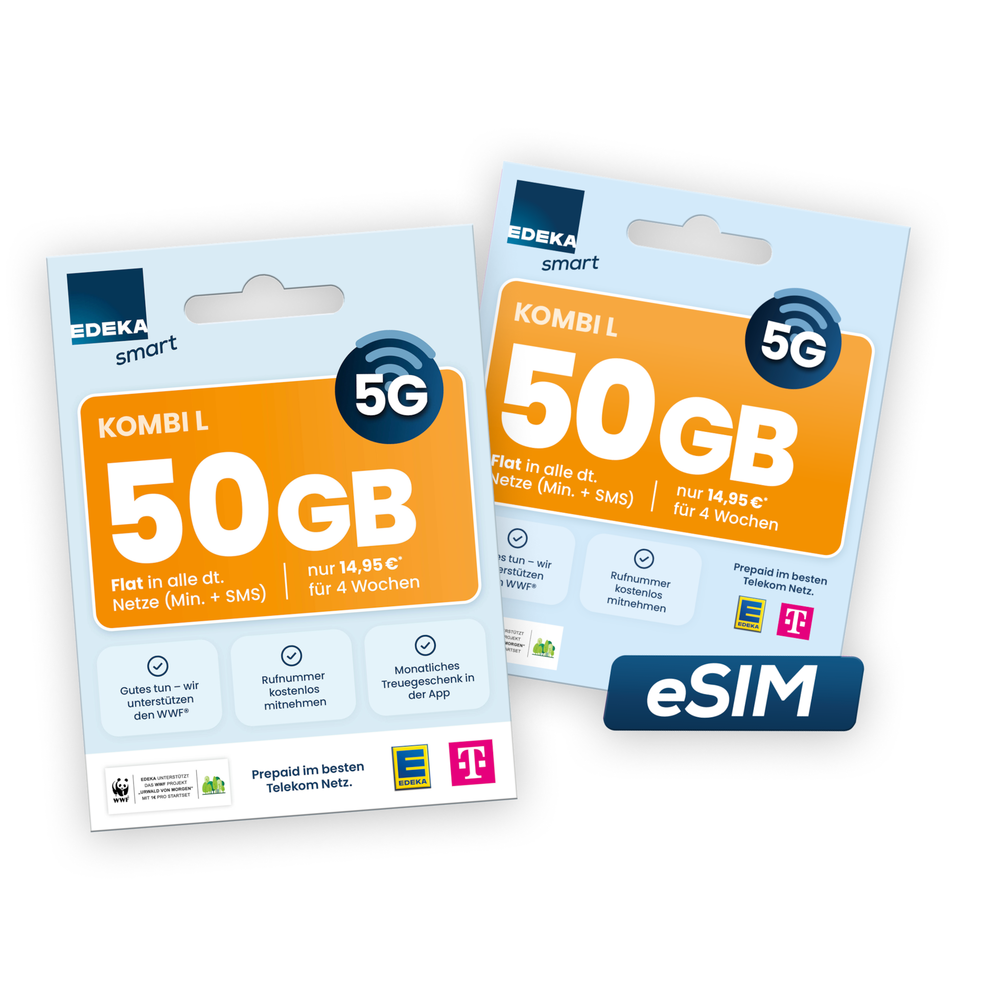 • EDEKA smart kombi L kostet 14,95 € / 4 Wochen und enthält 300 Min. in alle dt. Netze und eine Telefon und SMS Flat ins Telekom Mobilfunknetz – jeweils auch im EU-Ausland ohne Zusatzkosten nutzbar.