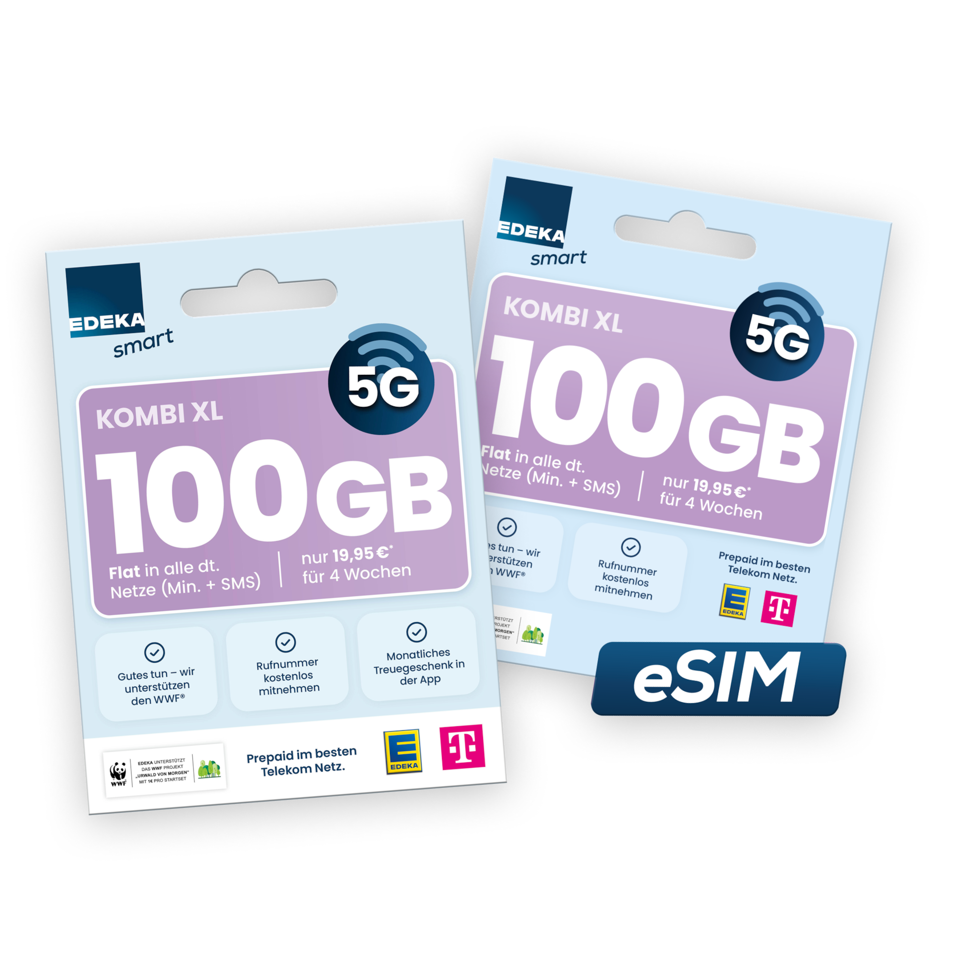 • EDEKA smart kombi XL kostet 94,95 € für 4 Wochen und enthält eine Telefon und SMS Flat in alle dt. Netze – jeweils auch im EU-Ausland ohne Zusatzkosten nutzbar. Mit unbegrenztem Highspeed-Volumen mit bis zu 100 Mbit/s und 5G.