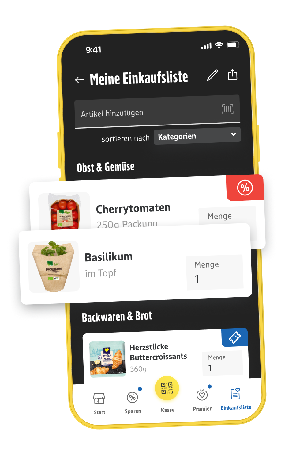 Füge einfach deine Lieblingsprodukte hinzu und entdecke dabei aktuelle Angebote. Die Liste ist sogar dein intelligenter Einkaufshelfer: Sie sortiert alle Artikel automatisch nach Warenwelt – so findest du alles schneller im Markt.​