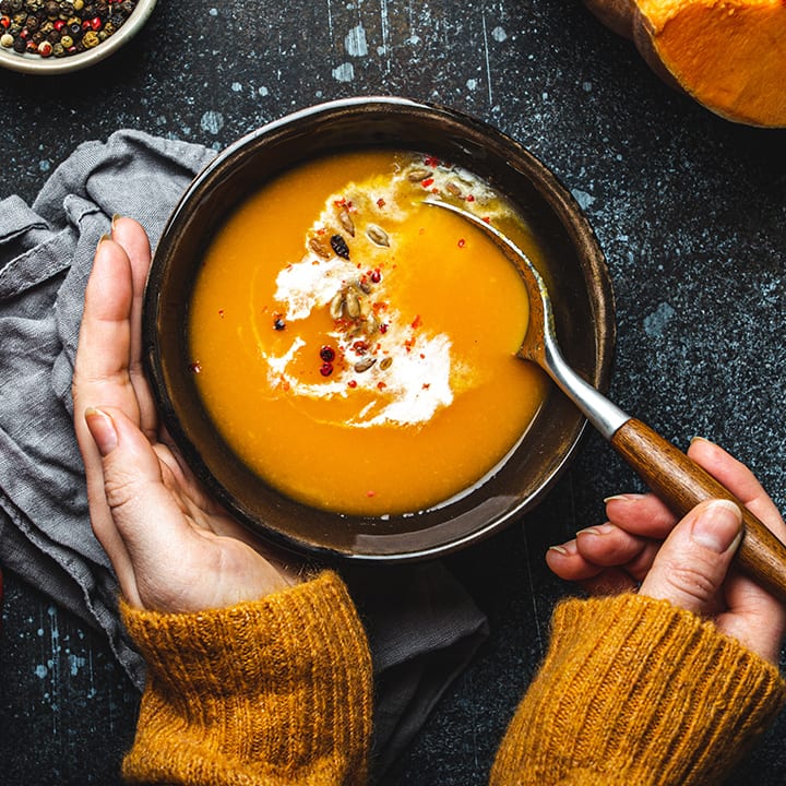 Ob cremig oder klar, Suppen sind im Herbst Balsam für die Seele und wärmen wunderbar von innen. Ein echter Klassiker: Suppe aus Hokkaido- oder Butternut-Kürbis. Ebenfalls sehr beliebt: Kartoffelsuppe – die kannst Du sowohl vegan zubereiten als auch mit Würstchen oder herzhaftem Speck, zum Beispiel von unserem Produktionsbetrieb Schwarzwaldhof, verfeinern. Oder wie wäre es mit einer kräftigen Hühnersuppe mit viel frischem Gemüse? Zu den kulinarischen Stars in der goldenen Jahreszeit gehören definitiv auch Pilze. Nach einem Herbstspaziergang durch den Wald mit raschelndem Laub unter den Füßen schmeckt so ein heißes Pilzsüppchen besonders fein.