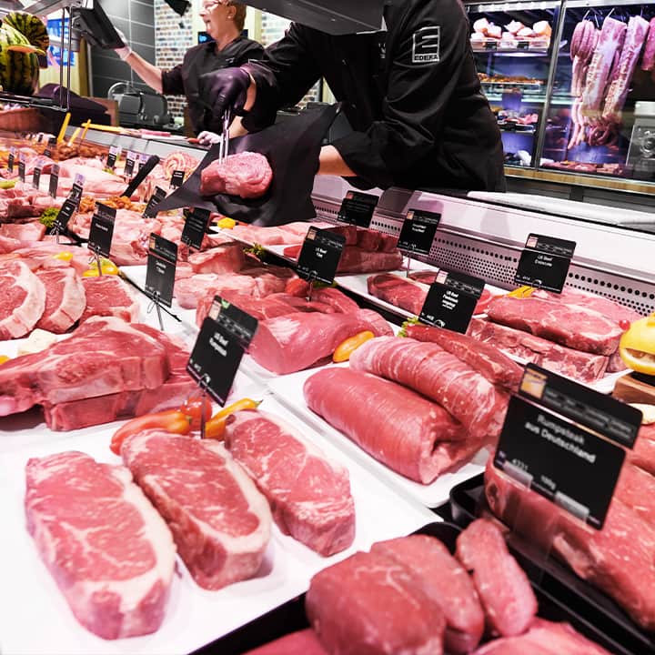 Unsere Theken haben viel zu bieten – von internationalen Spezialitäten bis hin zur Wurst aus dem Schwarzwald. Besonders stolz sind wir auf unsere handwerklich zubereiteten Eigenherstellungen und die zahlreichen Eigenmarken, die wir seit vielen Jahren im Programm haben – wie Schwarzwald Bio-Weiderind, Hofglück, Badisches Bauernkalb oder Württemberger Lamm. Kooperationen mit regionalen Erzeugerbetrieben wie