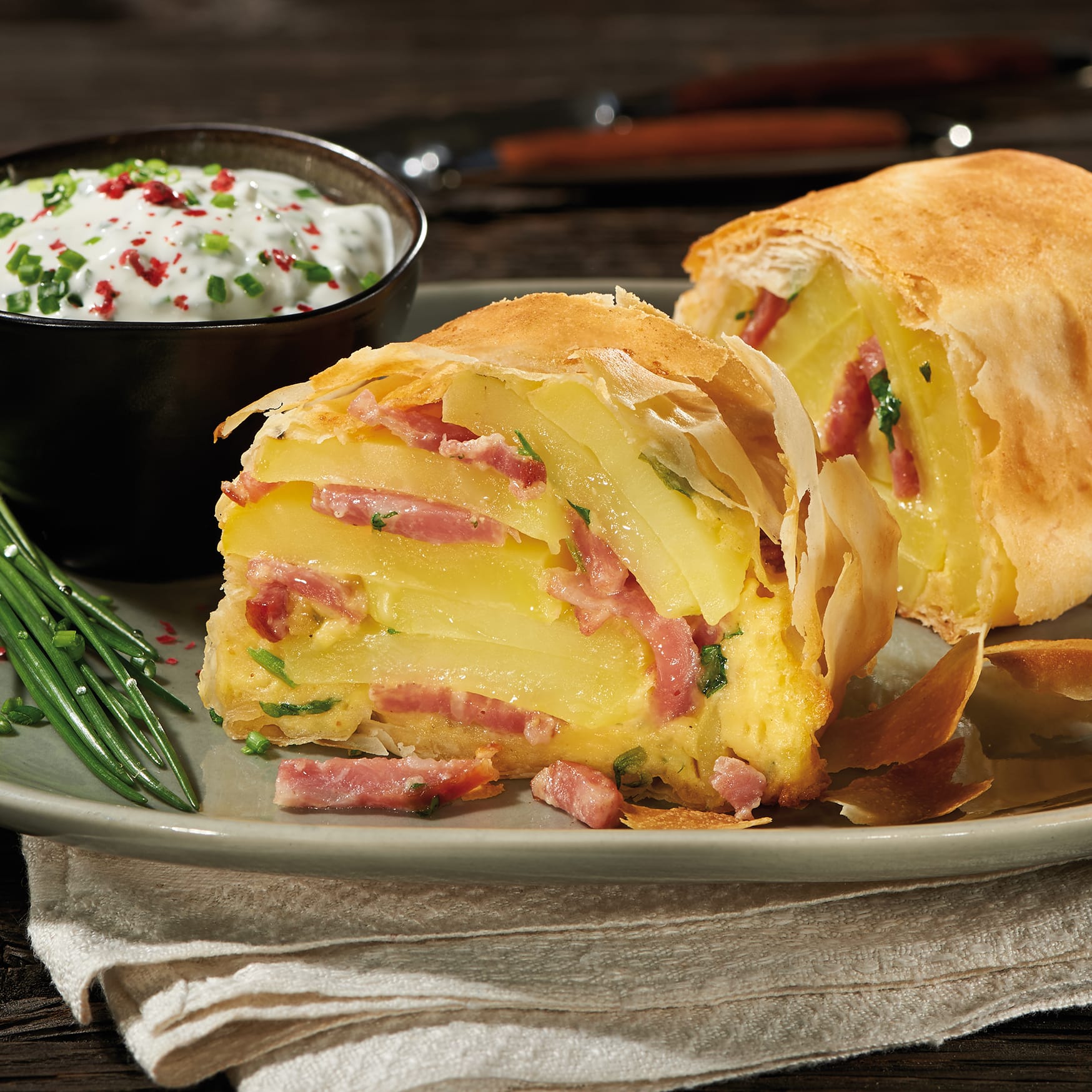 Vorgegarte Kartoffeln und die roh geräucherten Schinkenstreifen von Schwarzwaldhof ergeben zusammen eine köstliche Strudel-Füllung. Dazu ein feiner Limetten-Schmand und schon haben Sie ein leckeres Mittag- oder Abendessen.